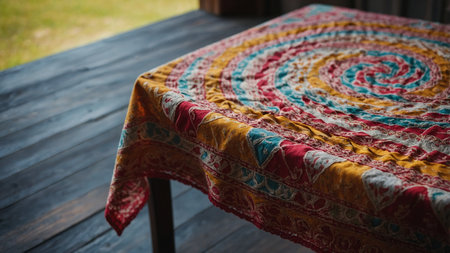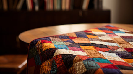 a colorful quilt, in the style of tokina opera 50mm f14 ff, adorns a wooden dining table. the quilt features a captivating combination of dark teal and amber hues. blurry details add an artistic touch, while smooth and curved lines create a visually pleasing design. this rebellious craft showcases the use of common materials, resulting in a rounded and inviting aesthetic. ai generated