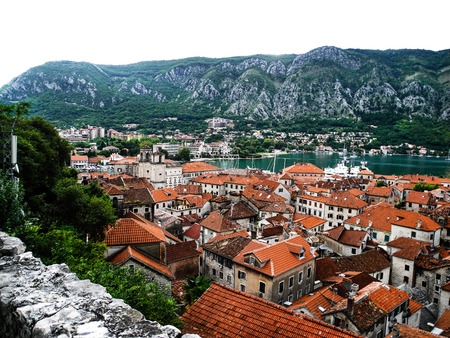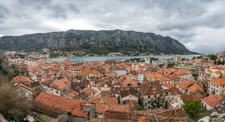 Panoramic aerial view of the red tiled roofs of the old town of Kotor and Kotor Bay