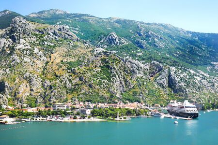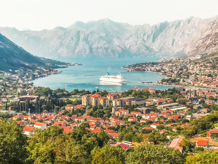 Montenegro. Boka Bay of Kotor. The Town Of Kotor. The view from the top. Liner in the port of Kotor. View of the old town Kotor. Photography with drone.