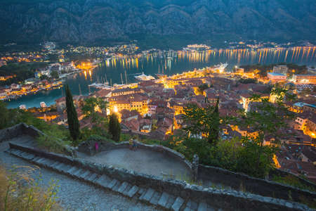 Sunset of Kotor Bay or Boka Kotorska with an illuminated ancient fortress city wall in the mountains, the Balkans, Montenegro on the Adriatic Sea