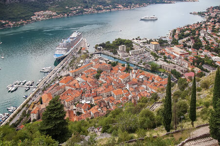 A panoramic view of the Bay of Kotor, cruise port, mountains and the medieval walled old town from the ruins of the Castle of San Giovanni