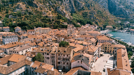 Narrow streets and small squares with old stone houses with red roofs. Kotor, Montenegro. Drone. High quality photo