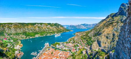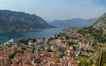 Kotor, Montenegro, beautiful top panoramic view of Kotor city old medieval town seen from San Giovanni St. John Fortress, with Adriatic sea, bay of Kotor and Dinaric Alps mountains in sunny day