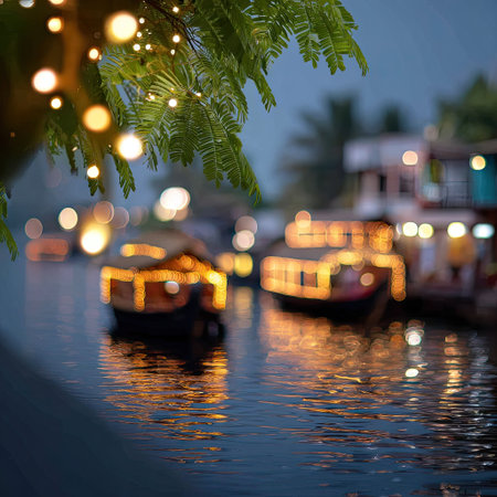 A tranquil night scene showcasing gentle ripples on the water, adorned with shimmering lights from nearby boats and illuminated foliage, creating a serene atmosphere.
