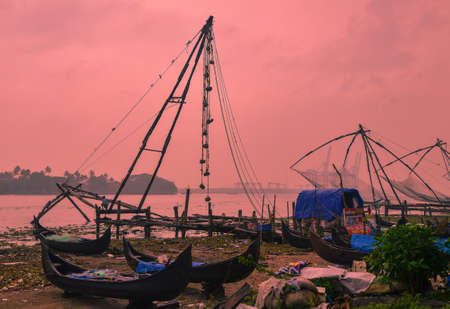 Fort Kochi, Kerala, India - Circa November 2012 - Chinese fishing nets and fishing boats in Fort Kochi, Kerala, India