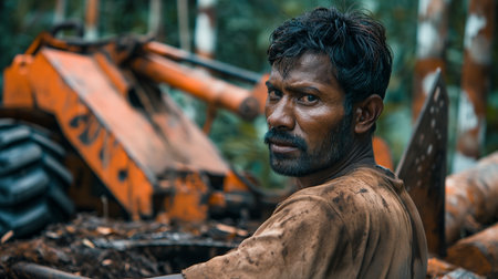 Portrait of Indian lumberjack with chainsaw in his hand.