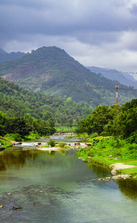 The mountains and river at Kiriwong village on a cloudy day. The beautiful landscape of Kiriwong village located at Laan Saka district, Nakhon Si Thammarat, Thailand. Vertical View.