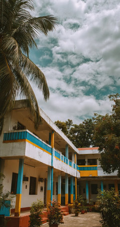 A two-story school building exterior is shown beneath a partially cloudy sky. The architecture features a mix of white, blue, and yellow elements. Palm fronds frame the composition adding a natural element. This image may be suitable for educational, architectural, or design-related projects.