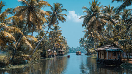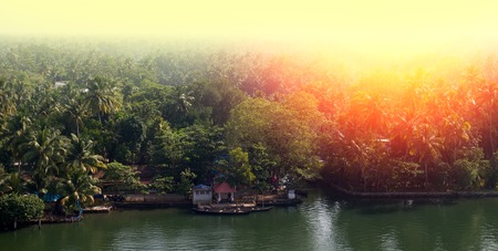 Kerala backwaters, India. Tropical landscape. Channels with ships (fishing boats) and towns under palm trees