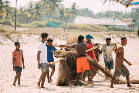 Goa, India - February 12, 2020: Fishermen Stack Nets On Shore