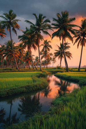 A tranquil landscape features tall palm trees lining a waterway reflecting the warm hues of the sunset. The scene displays lush green vegetation, contrasting against the vibrant orange and pink sky. The composition emphasizes natural beauty suitable for various commercial and editorial applications.
