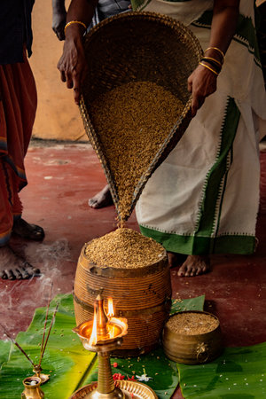 ALLEPPEY, INDIA, MAR 13, 2018: Woman pours grain into basket as offering to the Hindu temple
