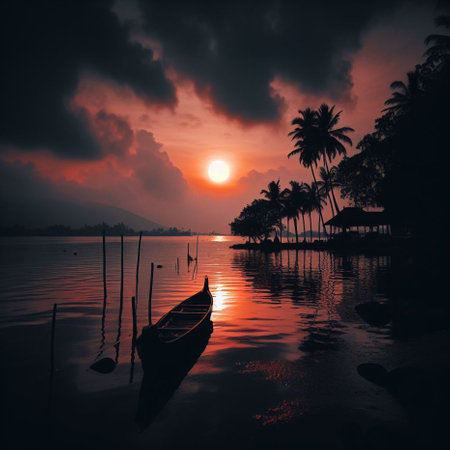 Fishing boat on the lake at sunset. Kerala, India.