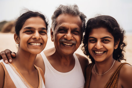 Portrait of Indian father with his two daughters at the beach. Father's day concept. Generative AI