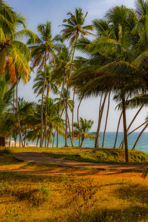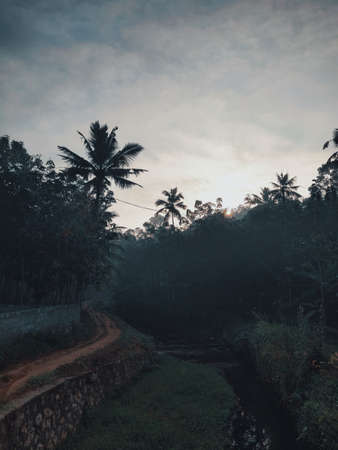 coastal landscape view with coconut trees and mud road