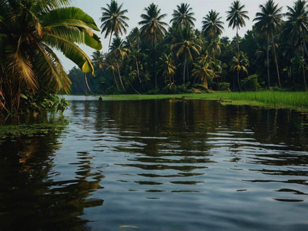 A tranquil river scene featuring lush palm trees alongside calm waters, reflecting soft clouds above. Perfect for evoking serenity and natural beauty.
