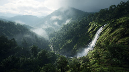 Discover a breathtaking landscape showcasing a coffee plantation enveloped in misty mountains. The serene environment invites exploration and connection with nature.