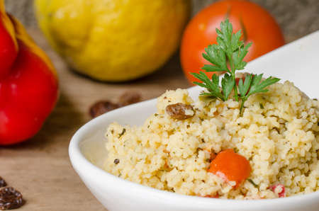 Couscous with vegetables and pomegranate on wooden background