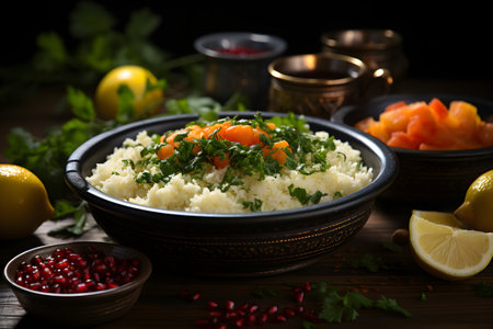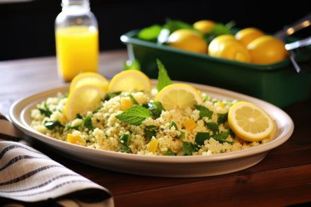 couscous salad with lemon wedges on a rectangular ceramic plate, created with generative ai
