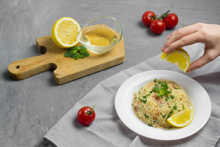 Traditional Arabic salad or Tabbouleh on white plate, healthy vegetarian dish with couscous, tomatoes, parsley and mint. Lemon and olive oil on cement background