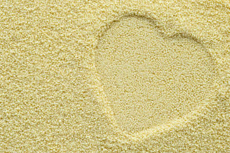 A heart imprinted in couscous. Symbol of heart graved on couscous groats. Heart stamp. Heart prints. Valentine concept. Healthy food.