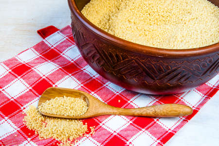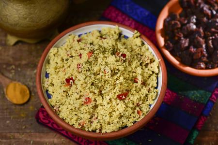 Raw couscous in rustic plate