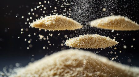 Semolina grains are suspended mid air creating striking visual their texture and individual particles. dark background enhances levitation effect drawing attention.