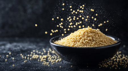 Couscous groats float gracefully bowl showcasing their individual textures and vibrant color dark backdrop creating captivating visual experience.