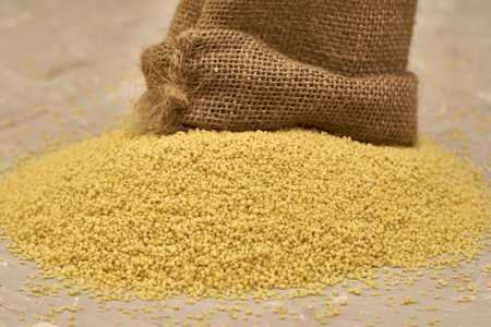 crop couscous poured out of a canvas bag on the table. high quality photo