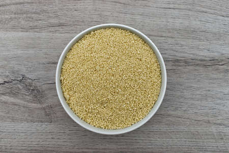 Bowl of raw Couscous isolated on wooden background. Top view.