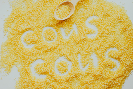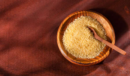Dry yellow couscous in wooden spoon. Top view.