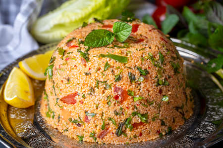 Close up of a traditional Arabian dish: Tabouleh salad with couscous, tomatoes and parsley.