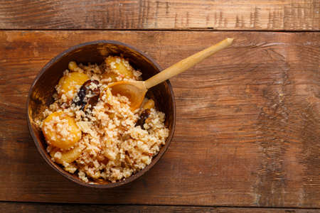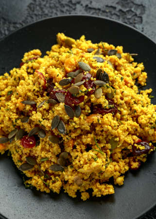 Morrocan style fruit couscous salad with raisins, dried apricots and pumpkin seeds on dark background