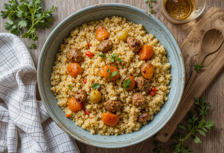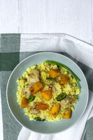 Couscous with meat and vegetables, festive Moroccan dinner, overhead flat lay shot with copy space, with fresh herbs and a wooden spoon