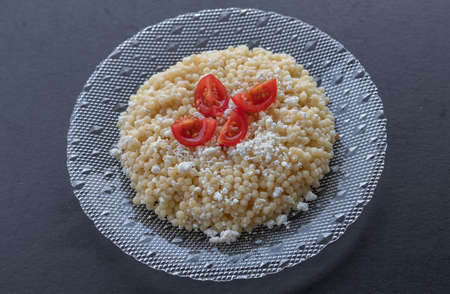 Homemade pasta ptitim with cheese on gray table. top view. ; Turkish name is Couscous
