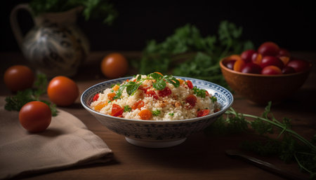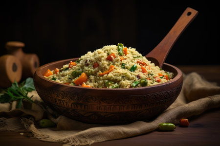 An image featuring a bowl filled with rice and various vegetables, placed beside a wooden spoon, Couscous with vegetables presented in a wooden spoon on a rustic background, AI Generated