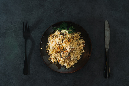Couscous with vegetables on black stone. Top view Copyspace