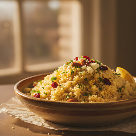 A bowl of cooked couscous is ready to be eaten