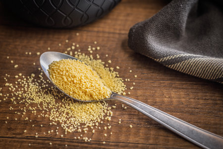 Uncooked couscous on a spoon on a wooden table.