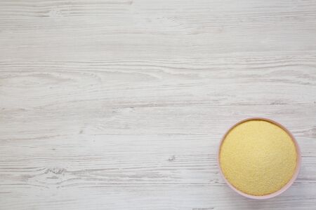 Dry semolina durum flour in a pink bowl over white wooden background, overhead view. Top view, from above, flat lay. Copy space.