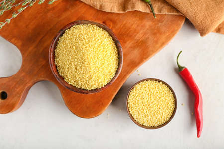 Bowls of raw couscous on light background