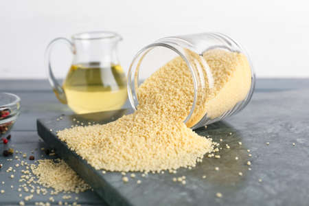 Jar with raw couscous on table