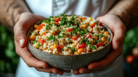 A vibrant dish of quinoa adorned with fresh herbs and colorful vegetables held with care.