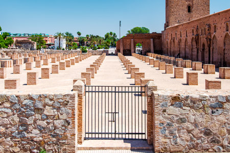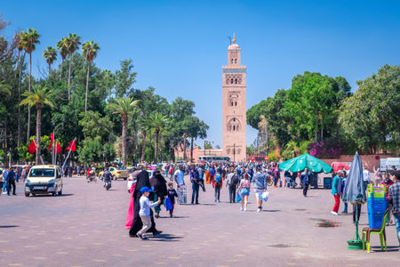 MARRAKECH, MOROCCO - Jun 03, 2018: Outside the famous minaret of the Koutoubia mosque in Marrakech, Morocco, Africa
