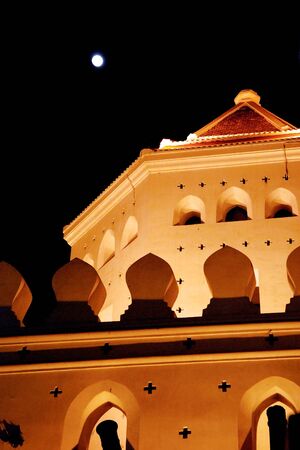 Detail of Islamic Mosque. It is an old architectural building in the middle of the Moroccan city. It is a typical Moroccan building with red bricks. It's a beautiful pattern.
