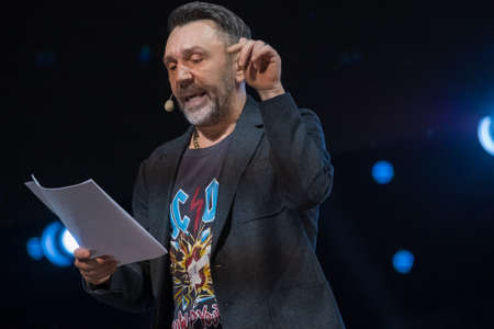 Moscow, Russia - April 23, 2018: Russian rock musician celebrity Sergey Shnurov performs at the business conference