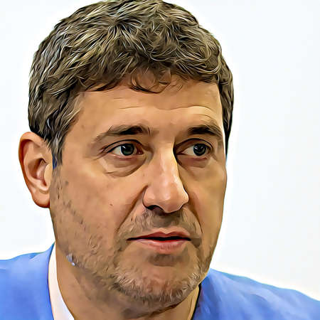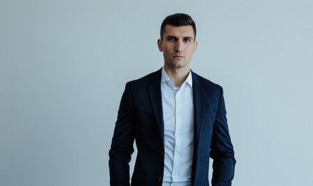 Minimalist portrait of a man in a dark blue suit against a plain white background