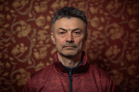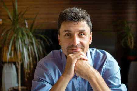 bust front portrait of middle aged man in blue t shirt isolated against grey background and looking