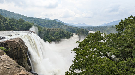 a mystical white waterfall at the center of a dark green forest surrounded by hills and mountains in the summer