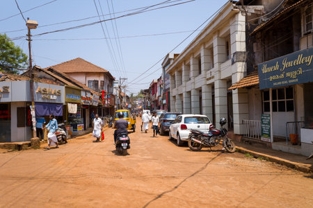Kannur, India - March 13, 2023: A dirt street in the city center is lined with small shops, including jewelry stores with signage in English and Malayalam, parked cars and motorcycles, pedestrians, and overhead power lines under clear skies.